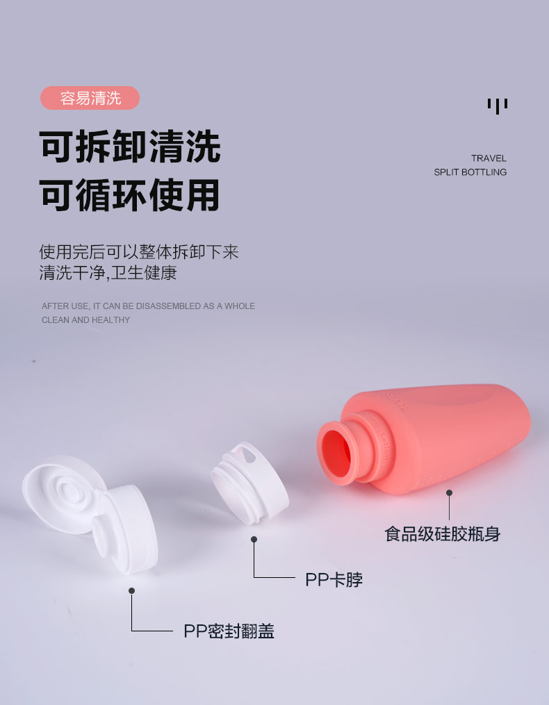 材質(zhì): 食品級硅膠瓶身+PP卡脖+PP瓶蓋