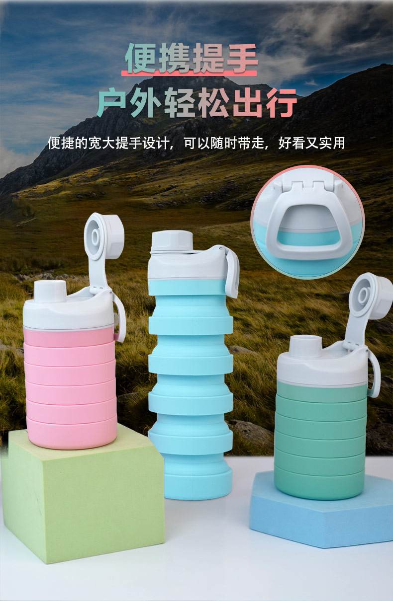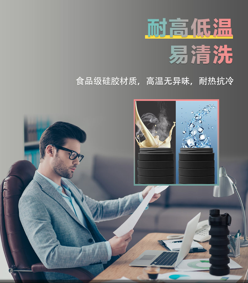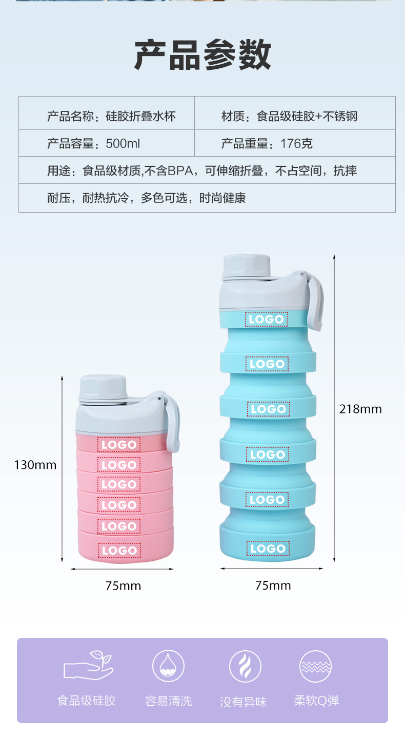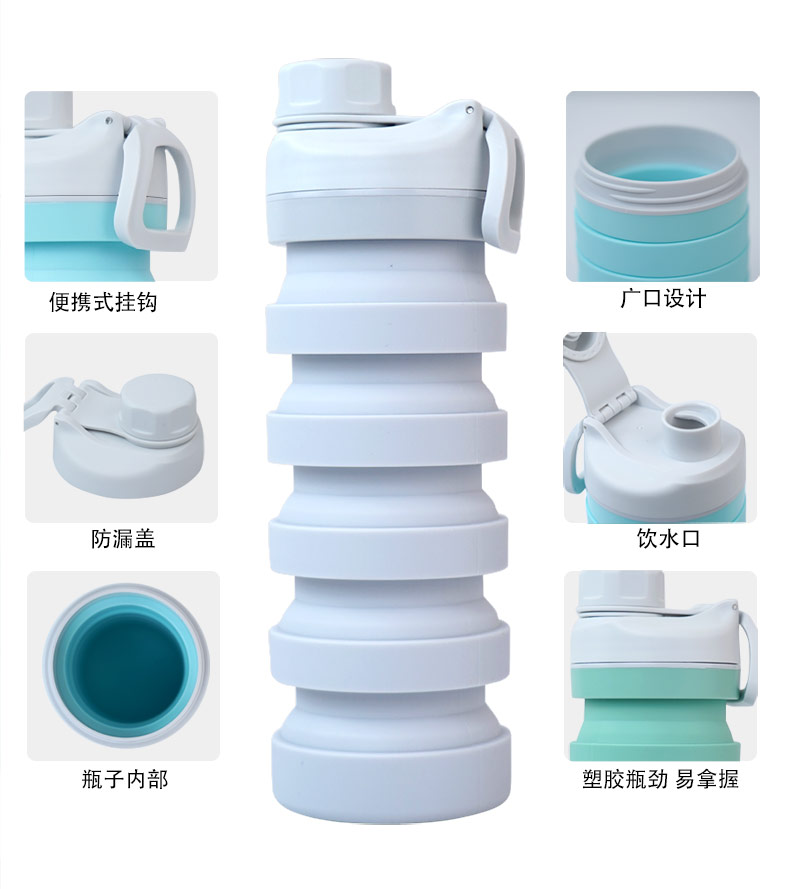 用途:食品級材質(zhì),不含BPA,可伸縮折疊,不占空間,抗摔 耐壓,耐熱抗冷,多色可選,時尚健康